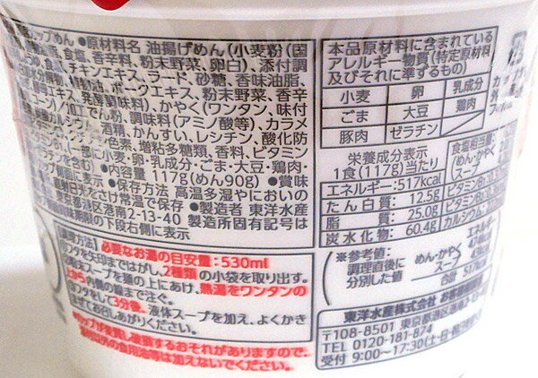●栄養成分(1食(117g)当り) エネルギー・・・517kcal たんぱく質・・・12.5g 脂質・・・25.0g 炭水化物・・・60.4g 食塩相当量・・・6.2g ビタミンB1・・・0.37mg ビタミンB2・・・0.36mg カルシウム・・・222mg 117g【メーカー・製造または販売元】東洋水産株式会社0120-181-874【広告文責】株式会社イージャパンアンドカンパニーズ 072-875-6666《ご注意ください》 ※商品がリニューアルしている場合、リニューアル後の商品にてお届けとなる場合がございます。