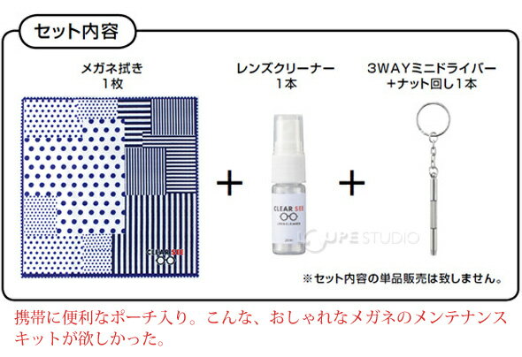 メガネ拭き クリアシーめがねのメンテナンスキット レンズクロス 眼鏡拭き レンズ おすすめ クリーナー 時計 楽器 カメラ 液晶モニター お手入れ 携帯 スペックメガネ拭き仕様ギザカットサイズ15×15cm素材ポリエステル、ナイロンレンズクリーナーボトルサイズH83mm×φ20mm成分水、イソプロピルアルコール容量20ML3WAYミニドライバー本体サイズ6センチ(チェーン部5センチ)仕様+ドライバー/00 -ドライバー/1.7mm 六角ナット2.2〜2.5mm素材合金 名古屋眼鏡株式会社 3175※仕様及び外観は改善のため、予告なく変更することがあります。