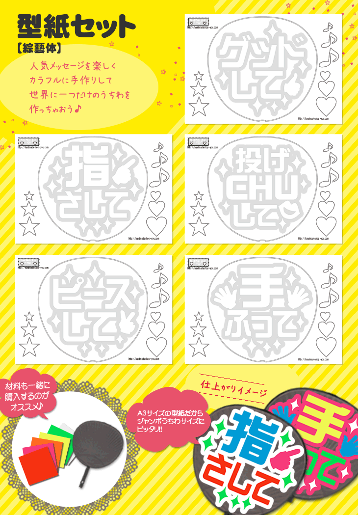 型紙はA3サイズ用紙で作成してありますので、 ジャンボうちわ ≪サイズ:タテ約285mm×ヨコ約295mm≫ のメッセージ作成にピッタリ! うちわは手作りしたいけど、型紙を作る時間がない時に、いかがでしょうか。
